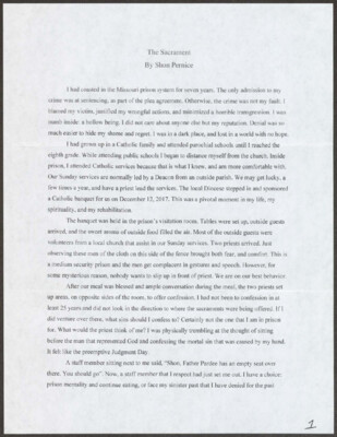 The Sacrament By Shon Pernice I had coasted in the Missouri prison system for seven years. The only admission to my crime was at sentencing, as part of the plea agreement. Otherwise, the crime was...