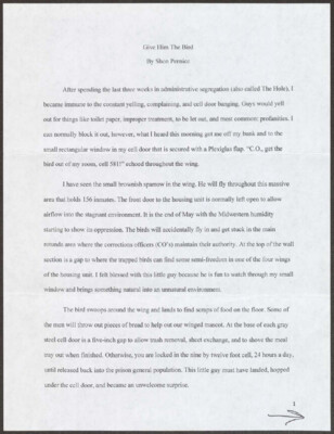 Give Him The Bird By Shon Pernice After spending the last three weeks in administrative segregation (also called The Hole), I became immune to the constant yelling, complaining, and cell door banging. Guys would yell...