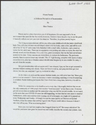 Word Count 1566 Prison Parody A Different Perception of Incarceration By Shon Pernice Prison can be a place that strips you of all happiness. It is not supposed to be an environment that parallels the...