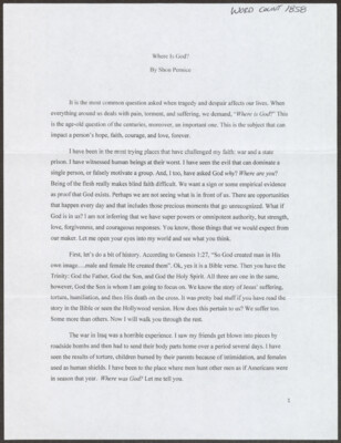 Word Count 1858 Where Is God? By Shon Pernice It is the most common question asked when tragedy and despair affects our lives. When everything around us deals with pain, torment, and suffering, we demand,...