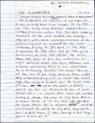 By: Jessica Chambers The Peacekeeper 12-17-19 "Never remove another inmate from a arguement" On 01-06-2019 at NDOC FMWCC in Las Vegas, NV I was walking back from Dinner to my POD in the Drug and...