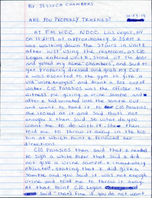 By: Jessica Chambers Are You Properly Trained? 12-23-19 At FM WCC NDOC Las Vegas, NV on 11-21-19 at approximately 6:35AM I was walking down the stairs in Unit E after just using the restroom, as...