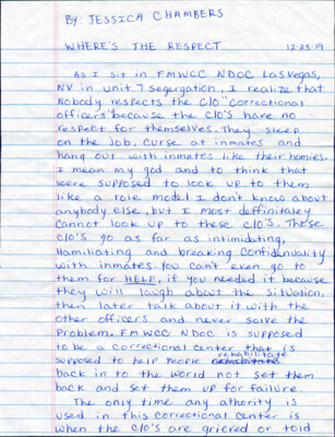 By: Jessica Chambers Where's the Respect 12-23-19 As I sit in FMWCC NDOC Las Vegas, NV in unit 7 segregation, I realize that nobody respects the c/o "correctional officers" because the c/o's have no respect...
