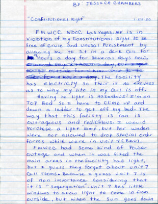 Constitutional Right By Jessica Chambers 1-24-20 FMWCC NDOC Las Vegas, NV is in violation of my constitutional right to be free of cruel and unusual punishment by allowing me to sit in a dark cell...