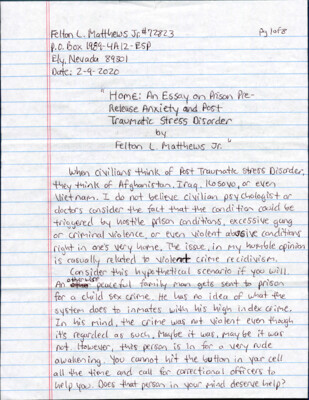 felton L. Matthews Jr. P.O. Box 1989-4A12-ESP Ely, Nevada 89301 Date: 2-9-2020 pg 1 of 8 “Home: An Essay on Prison Pre- Release Anxiety and Post Traumatic Stress Disorder by Felton L. Matthews Jr.” When...