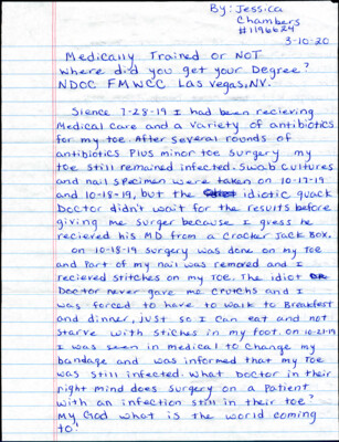 By: Jessica Chambers 3-10-20 Medically trained or not: Where did you get your degree? NDOC FMWCC Las Vegas, NV. Sience 7-28-19 I had been receiving medical care and a variety of antibiotics for my toe....