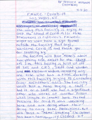 By: Jessica Chambers 4-3-20 FMWCC - Covid-19 Las Vegas, NV. The way this facility is trying to stop the spread of Covid-19/or take precautions is ridiculous. FMWCC might as well have a sign posted outside...