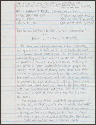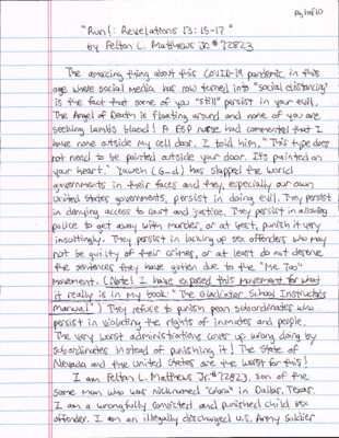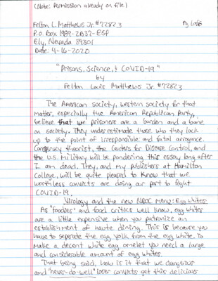 (Note: Permission already on file) pg 1 of 6 Felton L. Matthews Jr. P.O. Box 1989-2B32-ESP Ely, Nevada 89301 Date: 4-16-2020 "Prisons, Science, & COVID-19" by Felton Louis Matthews Jr. The American Society, Western Society...