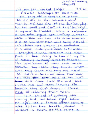 Jessica Chambers It's not the Masked Singer 5-9-20 FMWCC Las Vegas, NV on 5-9-20 The only thing consistint about this facility is the inconsistincey! That is the headline of the day every day for the...