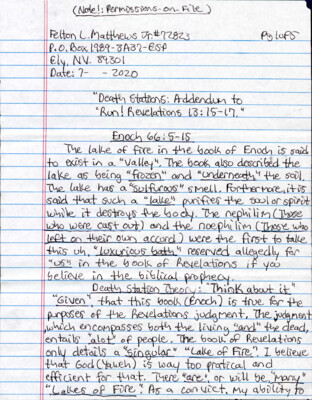 (Note!: Permissions-on-File) Felton L. Matthews Jr. P.O. Box 1989-3A37-ESP Ely, NV 89301 Date: 7- -2020 Pg 1 of 5 "Death Stations: Addendum to 'Run! Revelations 13:15-17.'" Enoch 66:5-15 The lake of fire in the book...
