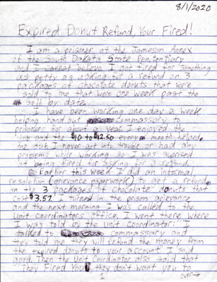 Expired Donut Refund, Your Fired! 8/1/2020 I am a prisoner at the Jameson Annex of the South Dakota State Penitentiary and I cannot believe I got fired for something as petty as asking for a...