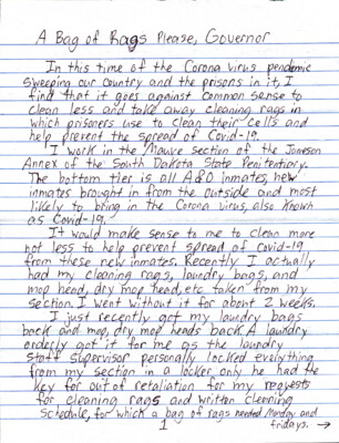 A Bag of Rags Please, Governor In this time of the Coronavirus pandemic sweeping our country and the prisons in it, I find that it goes against common sense to clean less and take away...
