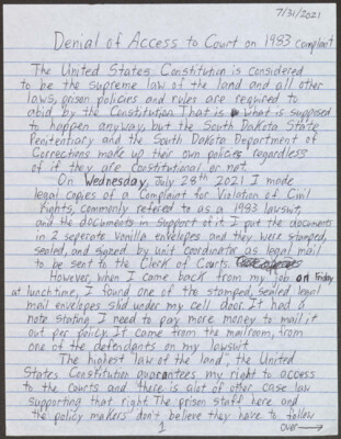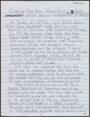 7/31/2021 Governor Fires Prison Officials, My Civil Rights Lawsuit Legal mail stalled, but I'm still INTREPID On Tuesday, July 13th 2021, South Dakota Governor Kristi Noem suspended Mike Leidholt. On Thursday, July 15th the Governor...