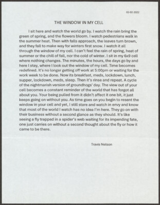 02-02-2022 THE WINDOW IN MY CELL I sit here and watch the world go by. I watch the rain bring the green of spring, and the flowers bloom. I watch pedestrians walk in the summer...