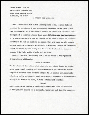 CARLOS REBOLLO Macdougall correctional I. 1153 East Street South Suffield, CT 06080 A STUDENT. NOT AN INMATE When I think about what higher learning means to me, I cannot help but consider the experiences I...