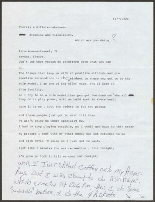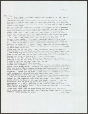 12/28/22 hey hey This Essay is about people having death in the family while Incarcerated The other day while writing a letter to my cousin, who lost his mom 15 months ago then to lose...