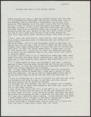 4/24/22 Onother day here in the penile system Today started out good, I did my prayers before the sun came up, ate,brushed my teeth,ETC, and we got 6 more days left to end Ramadan, and...