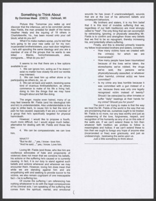 Something to Think About By Dominee Meek (OSCI) Oshkosh, WI Picture this: Tomorrow you wake up and discover that the infamous, yet to be convicted James Alex Fields, the man arrested for death of the...
