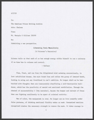 To: The American Prison Writing Archive Attn: Chelsea From: Mr. Marquis O Gilliam 330190 Re: Submitting a new perspective. Liberating Toxic Masculinity (A Prisoner's Narrative) Science tells us that each of us has enough energy...