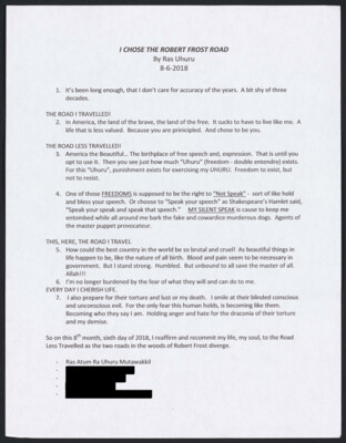I CHOSE THE ROBERT FROST ROAD By Ras Uhuru 8-6-2018 1. It's been long enough, that I don't care for accuracy of the years. A bit shy of three decades. THE ROAD I TRAVELLED! 2....