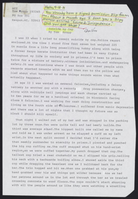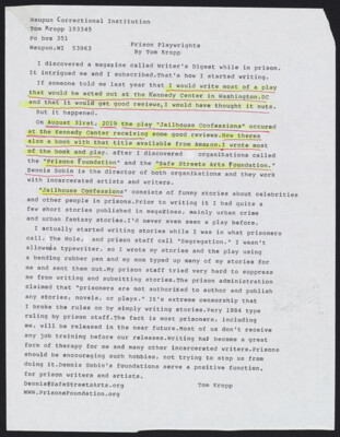 WCI Tom Kropp [ID] PO Box 351 Waupun, WI, 53963 Hello, 9-18-19 You already have a signed permission slip from me. About a month ago I sent you a 30 page memoir entitled "Crime &...