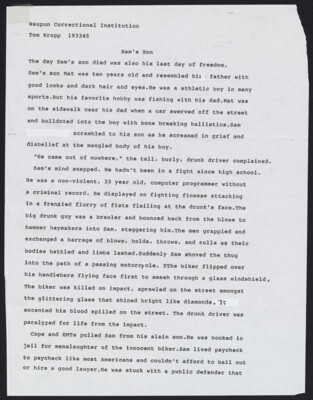 Waupun Correctional Institution Tom Kropp Sam's Son The day Sam's son died was also his last day of freedom. Sam's son Mat was ten year old and resembled his father with good looks and dark...
