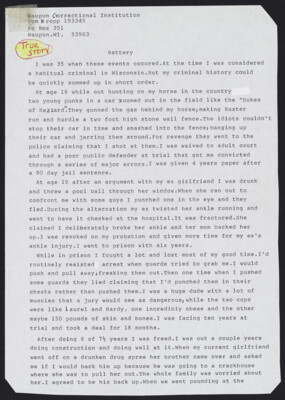 Waupun Correctional Institution Tom Kropp #[ID] P.O. Box 351 Waupun, WI, 53963 Battery True Story I was 35 when these events occurred. At the time I was considered a habitual criminal in Wisconsin. But my...