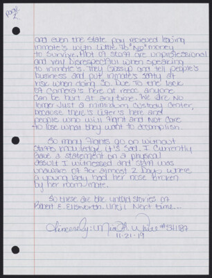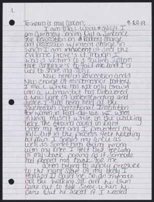 9.29.19 To: Whom it may concern; I am Mia L. White [ID]. I am currently serving out a sentence for revocation on a robbery charge and possession with intent charge in which I am innocent...