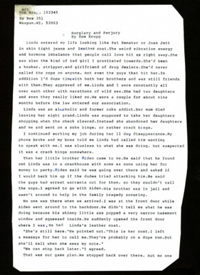 WCI Tom Kropp PO Box 351 Waupun, WI, 53963 Burglary and Perjury By Tom Kropp Linda entered my life looking like Pat Benatar or Joan Jett in skin tight jeans and leather coat. The weird...