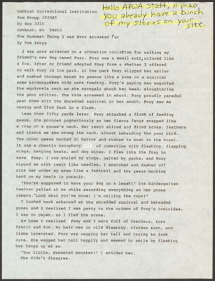 The Dumbest Thing I was Ever Arrested For By Tom Kropp I was once arrested on a probation violation for walking my friend's new dog named Foxy. Foxy was a small mutt; colored like a...