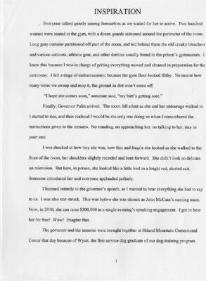INSPIRATION Everyone talked quietly among themselves as we waited for her to arrive. Two hundred women were seated in the gym, with a dozen guards stationed around the perimeter of the room. Long gray curtains...