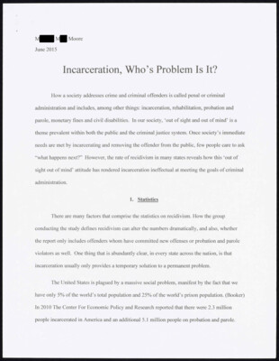 M M Moore June 2015 Incarceration, Who's Problem Is It? How a society addresses crime and criminal offenders is called penal or criminal administration and includes, among other things: incarceration, rehabilitation, probation and parole, monetary...