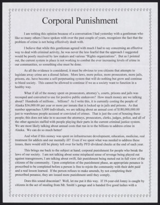 Corporal Punishment I am writing this opinion of a conversation I had yesterday with a gentleman who like so many others I have spoken with over the past couple of years, recognizes the fact that...