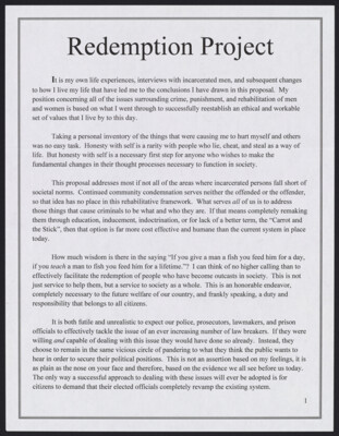 Redemption Project It is my own life experiences, interviews with incarcerated men, and subsequent changes to how I live my life that have led me to the conclusions I have drawn in this proposal. My...