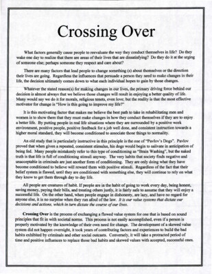 Crossing Over What factors generally cause people to reevaluate the way they conduct themselves in life? Do they wake one day to realize that there are areas of their lives that are dissatisfying? Do they...