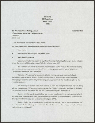 Sensei Pitt The American Prison Writing Archive December 2020 C/O Hamilton College: 198 College Hill Road Clinton NY 13323-1218 COVID Behind Bars: Stress and Anti-stress agents. The CDC recommends the following COVID-19 prevention measures; *...