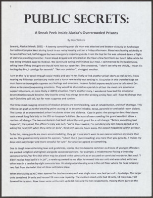 PUBLIC SECRETS: A Sneak Peek Inside Alaska’s Overcrowded Prisons By Ben Wilkins Seward, Alaska (March, 2022) — A twenty something year old man was attacked and beaten viciously at Anchorage Correction Complex West during lunch...