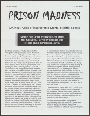 1. Prison Madness by Ben Wilkins PRISON MADNESS America’s Crisis of Incarcerated Mental Health Patients WARNING: THIS ARTICLE CONTAINS SUBJECT MATTER AND LANGUAGE THAT MAY BE DISTURBING TO SOME READERS. READER DISCRETION IS ADVISED. I...
