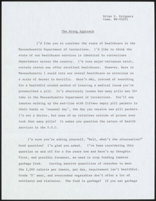 Brian D. Knippers Comm. #W-95692 The Wrong Approach I'd like you to consider the state of healthcare in the Massachusetts Department of Corrections. I'd like to think the state of our healthcare services is identical...