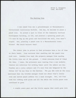 Brian D. Knippers Comm. #W-95692 The Healing Tree A man named Stan was a groundskeeper at Massachusetts Correctional Institution Norfolk. One day, he decided to plant a peach tree. He picked a spot in front...