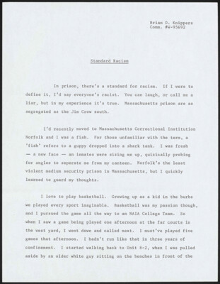 Brian D. Knippers Comm. #W-95692 Standard Racism In prison, there's a standard for racism. If I were to define it, I'd say eVeryone's racist. You can laugh, or call me a liar, but in my...