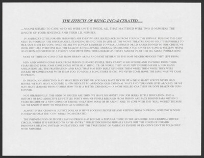 ...Noone seemed to care who we were on the inside, all that mattered were two (2) numbers: the length of your sentence and your I.D. number. In America's cities,...