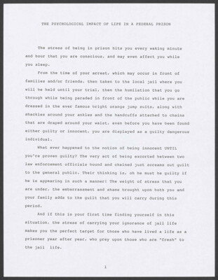 THE PSYCHOLOGICAL IMPACT OF LIFE IN A FEDERAL PRISON The stress of being in prison hits you every waking minute and hour that you are conscious, and may even affect you while you sleep. From...