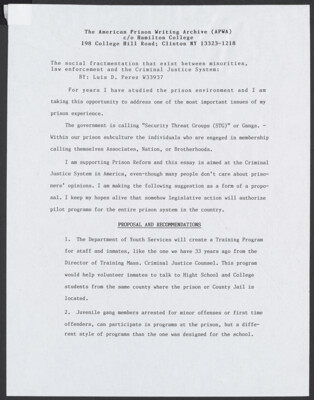 The American Prison Writing Archive (APWA) c/o Hamilton College 198 College Hill Road; Clinton NY 13323-1218 The social fractmentation that exist between minorities, law enforcement and the Criminal Justice System: BY: Luis D. Perez W33937...