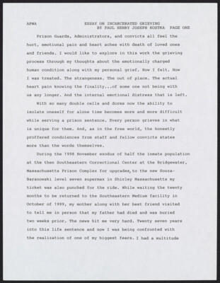 ESSAY ON INCARCERATED GRIEVING BY PAUL HENRY JOSEPH KOSTKA PAGE ONE Prison Guards, Administrators, and convicts all feel the hurt, emotional pain and heart aches with death of loved ones and friends. I would like...