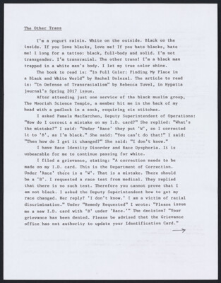 The Other Trans _ I'm a yogurt raisin. White on the outside. Black on the inside. If you love blacks, love me! If you hate blacks, hate me! I long for a tattoo: black, full-body...