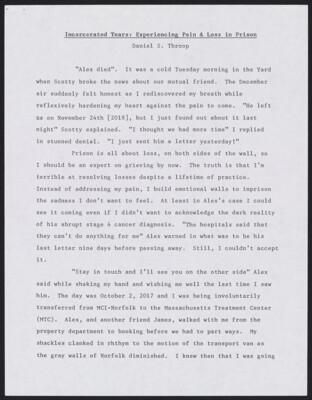 Incarcerated Tears: Experiencing Pain & Loss in Prison Daniel S. Throop "Alex died". It was a cold Tuesday morning in the Yard when Scotty broke the news about our mutual friend. The December air suddenly...