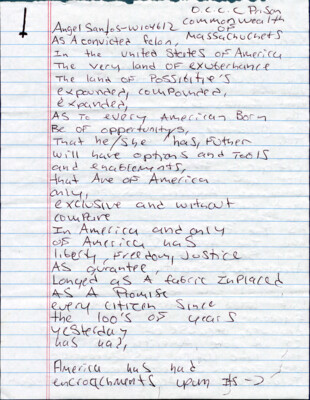 Angel Santos D.C.C.C Prison Commonwealth of Massachuchets As a convicted felon, in the United States of America the very land of exuberance the land of possibitie's expounded, compounded, expanded, as to every American born be...