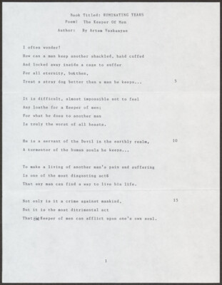 Book Titled: RUMINATING YEARS Poem: The Keeper Of Men Author: By Artem Vaskanyan I often wonder! How can a man keep another shackled, hand cuffed And locked away inside a cage to suffer For all...