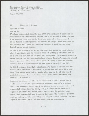 The American Prison Writing Archive Hamilton College; 198 College Hill Road Clinton, NY 13323 - 1218 August 12, 2022 RE: Education In Prisons Dear The Editors, How are you! I've been incarcerated since the year...